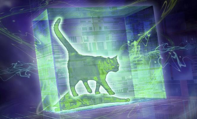 De cette ubiquité découle une des plus fameuses expériences de pensée de la mécanique quantique : celle du chat de Schrödinger. Supposons qu’on enferme dans une boîte opaque un chat et un noyau radioactif dont la désintégration – un événement aléatoire selon la mécanique quantique – déclenche un mécanisme mettant fin à la vie du chat (cette histoire m’a toujours semblé très cruelle…). Tant qu’aucun observateur ne va voir ce qui se passe dans la boîte, la mécanique quantique considère que le noyau est en réalité dans une superposition d’états, c’est-à-dire à la fois désintégré et non encore désintégré ; par conséquent le chat est à la fois mort et vivant… Beaucoup d’encre a coulé autour de ce paradoxe, et la question est loin d’être entièrement résolue.
