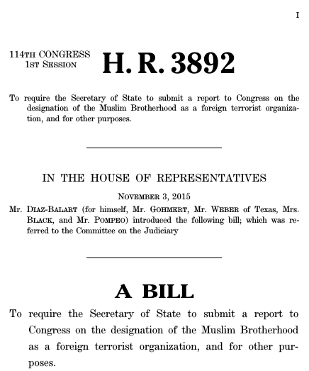 (Gulf News) – Un projet de loi qualifiant la Confrérie des Frères musulmans d’organisation terroriste étrangère par les États-Unis a reçu le feu vert du Comité judiciaire de la Chambre des représentants dominé par les Républicains, par un vote de 17 contre 10. Le projet de loi, qui oblige le Secrétaire d’État américain à agir, à moins de justifier son défaut de le faire, procédera ensuite devant la Chambre des représentants, et sera approuvé sans contestation par le Comité du Sénat sur les relations étrangères.
