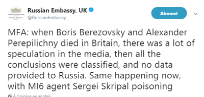 Expulser des diplomates? Possible, cela avait d’ailleurs été la réponse avec l’empoisonnement de Litvinenko en 2006. Mais T. May a déclaré que la réponse sera plus forte. Il est donc possible de conjuguer cette mesure avec d’autres, ou bien d’aller à la rupture des relations diplomatiques. Ce qui serait surprenant du côté de la Grande-Bretagne, car ce monde pour exister a besoin d’être reconnu, il a besoin que tous les acteurs importants soient en situation de perpétuelle communication comme un drogué a besoin de sa dose. Sinon, il perd le contrôle.