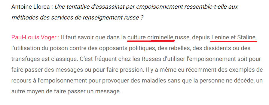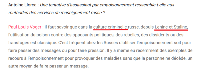 L’on apprend ainsi que S. Skripal a été empoisonné par un produit spécialement développé en URSS à la fin de la guerre froide, le Novichok. Ce produit étant spécifique à la Russie, la Russie est responsable. T. May ne sait pas si les dirigeants russes ont pris eux-même la décision ou s’ils ont perdu le contrôle sur le produit, mais ça ne change rien. Puisque la Russie est un danger, voir le Donbass, ses nombreuses ingérences, etc., ça ne change rien la Russie est coupable. Une argumentation totalement hystérique, [1] tout y est passé: