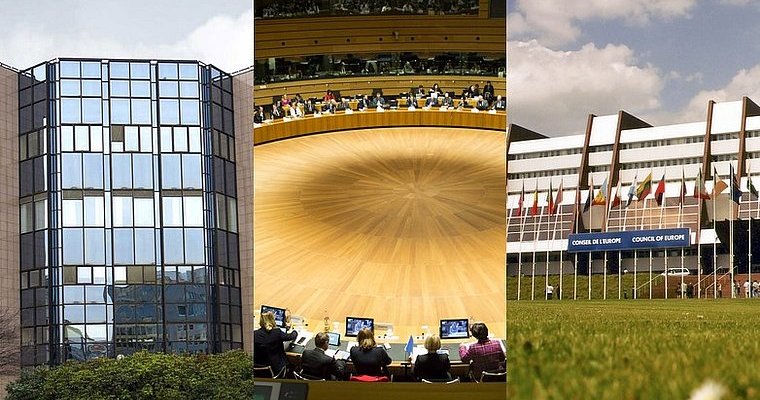 De gauche à droite : bâtiment du Conseil européen et du Conseil de l’UE (Justus Lipsius) ; réunion du Conseil de l’UE ; bâtiment du Conseil de l’Europe (palais de l’Europe).