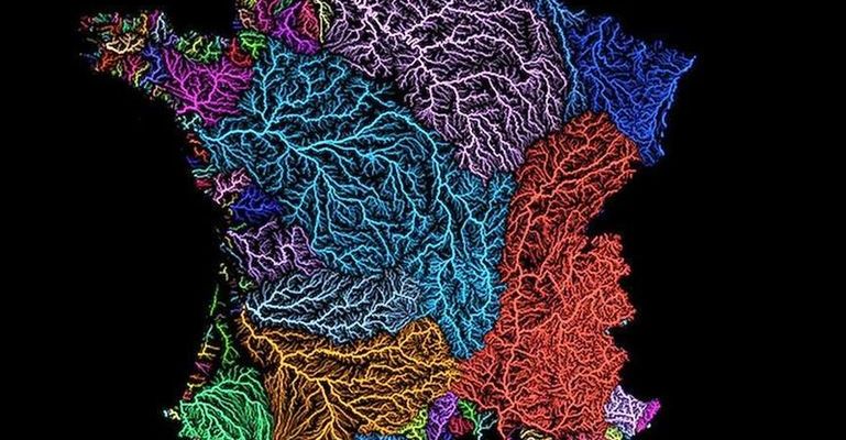 Les cartes scientifiques et multicolores de Robert Szucs montrent à quel point les cours d’eau recouvrent le territoire. Tous les cours d’eaux de la même couleur proviennent de la même source et se jettent ensuite dans l’océan. Sur les cartes présentées dans le diaporama ci-dessous, il est facile d’identifier les cinq principaux fleuves en France, le Rhin, le Rhône, la Seine, Garonne et la Loire. Les grandes tâches de couleur visibles illustrent les bassins hydrographiques à travers le monde. Ce sont des bassins de grande taille drainés par un réseau de cours d’eau et de leurs affluents, qui se déversent vers la mer par une embouchure, un estuaire ou un delta.