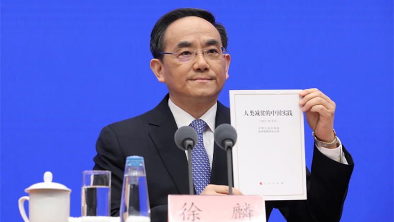 Xu Lin – directeur adjoint du Département de la publicité du Comité central du PCC et ministre du Bureau des informations du Conseil des affaires d’État, présente le livre blanc « Réduction de la pauvreté : l’expérience et la contribution de la Chine ».CF/ http://french.china.org.cn/china/txt/2021-04/07/content_77384148.htm