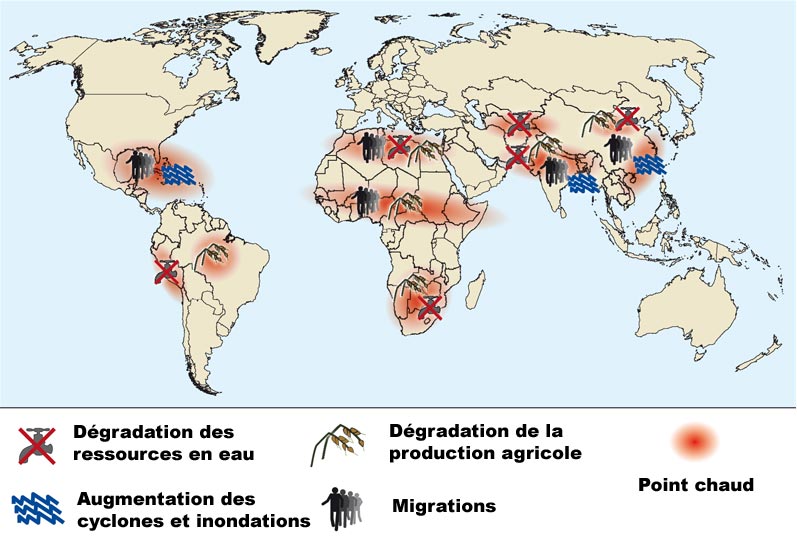 Au GIEC, le désaccord entre modèles est total. Cependant, les climats froids génèrent davantage de famines que les climats chauds. A cela s’ajoute que la Russie et le Canada verront leurs ressources agricoles favorisées. On entend rarement les médias affirmer qu’il n’y a pas de lien mécanique entre rareté des ressources et conflits. Mieux encore : c’est parfois l’abondance qui génère des conflits qui à leur tour engendrent généralement des pénuries.