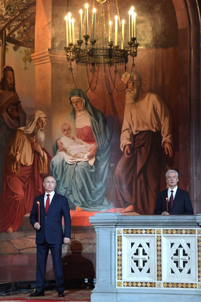 Vladimir Poutine et le maire de Moscou Sergueï Sobianine, ont assisté au service de Pâques de minuit à la cathédrale du Christ-Sauveur, dirigé par le patriarche Kirill de Moscou et de toute la Russie.