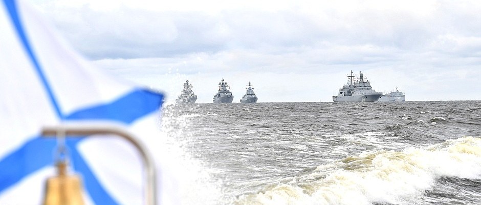 Le défilé naval principal. Le président ayant fait le tour de la ligne de parade des navires militaires russes le long de la rivière Neva a salué les équipages des navires. Photo : RIA Novosti