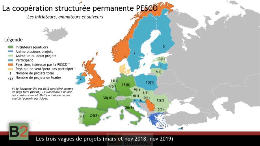 La coopération dans le cadre de la PESCO repose sur des projets individuels des États membres dans des domaines spécifiques de la défense, souvent avec le soutien de fonds provenant du nouveau Fonds européen de défense. L’un des objectifs était d’accroître l’efficacité des dépenses de défense en évitant la duplication des investissements.