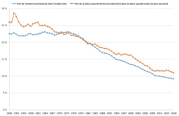 Part de l’emploi industriel manufacturier dans l’emploi total de 1949 à 2018. Comptes nationaux, base 2014, Insee. Traitement La Fabrique de l’industrie