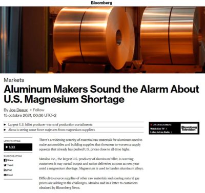 Aujourd’hui je voulais vous parler de l’aluminium. C’est le site Bloomberg ici qui est un site de premier plan de l’information économique et financière qui sonne l’alarme sur la fabrication d’aluminium parce que nous avons un problème de fabrication… de magnésium. Où que vous regardiez ce sont des conséquences en chaîne qui viennent frapper directement notre outil productif mondialisé.