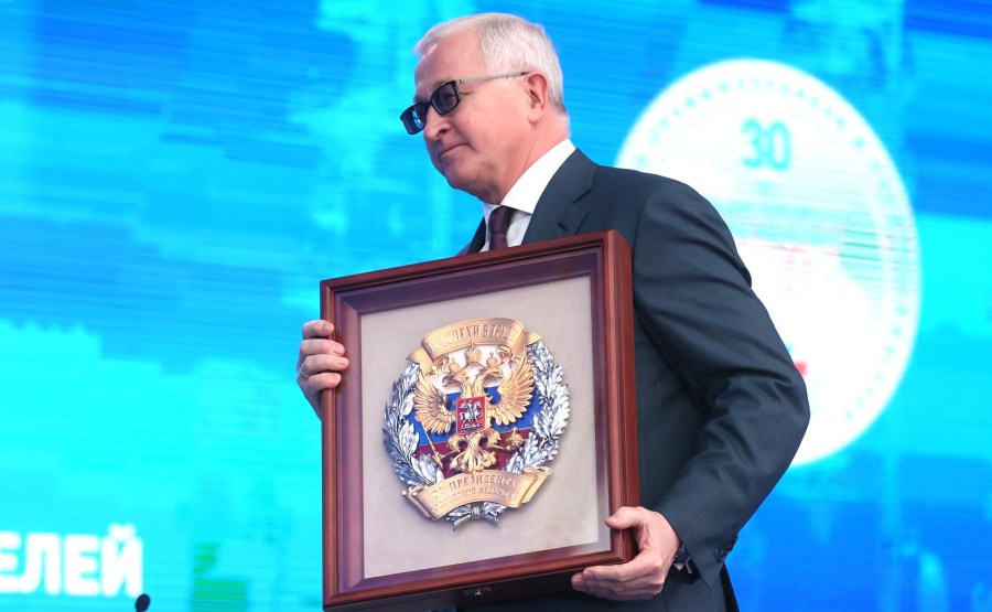 Le président de la RSPP, Alexander Shokhin, avec l’emblème distinctif « Pour une bonne performance » conféré à l’équipe de la RSPP par le président.