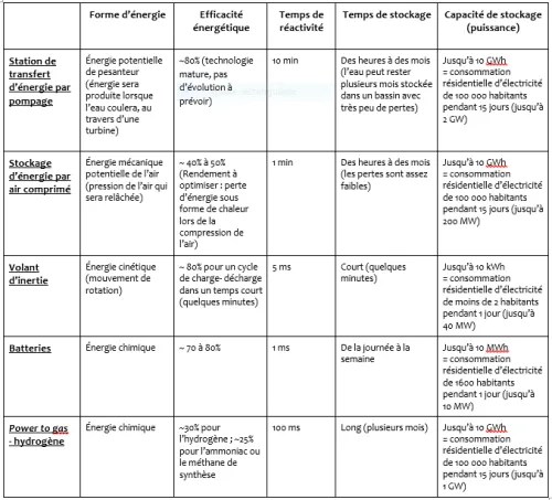 Différentes technologies de stockage de l’électricité existent, à des stades plus ou moins matures, et répondent à des besoins multiples liés à ces ressources variables : stockage infra-journalier, stockage hebdomadaire et stockage saisonnier. Pour les premières catégories, les batteries semblent plus prometteuses, en particulier lithium-ion à court terme, et d’autres en cours de développement, tandis que l’hydrogène conviendrait à un stockage de plus long terme en complément des stations hydroélectrique de pompage déjà présentes en France. En plus de l’apport dans l’équilibrage du réseau électrique, le stockage peut trouver une pertinence particulière dans les zones non-interconnectées.
