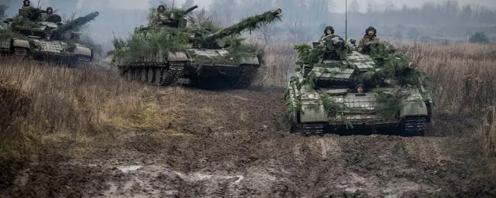 Des militaires ukrainiens marchent entre des chars russes détruits lors de combats à Dmytrivka (ouest de Kiev), le 2 avril 2022/afp.com/Genya SAVILOV