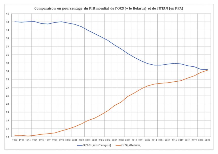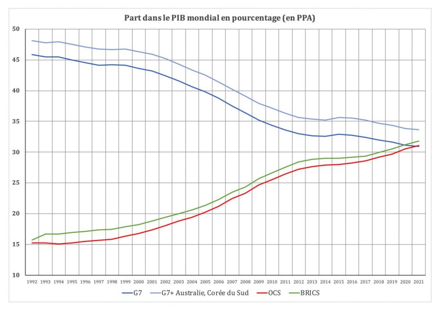 L’OCS est donc une organisation de coopération [37]. Elle ne se fonde pas sur la prétention d’un partage des souverainetés, une idée qui recouvre constamment la négation de la souveraineté, mais elle pose en principe le fait que la coopération réciproque est le meilleur instrument pour gérer les différences d’intérêts [38]. L’OCS s’est ainsi dotée à la fois d’institution de sécurité mais aussi d’institutions de développement économique comme d’une banque d’investissement. Les huit nations qui composent l’OCS [39] réunissent 41,4% de la population mondiale et 23% du PIB mondial. Elles comptent donc assurément. Et, la montée progressive en puissance de l’OCS face à la désagrégation du G-7 nous en dit beaucoup sur ce qui est en train de se jouer actuellement.