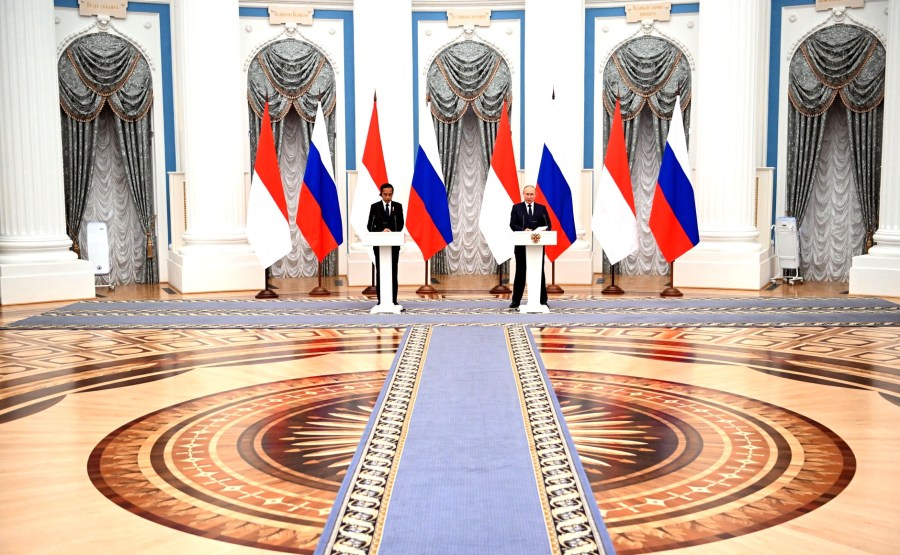 Président de la République d’Indonésie Joko Widodo (retraduit) : Tout d’abord, je voudrais exprimer ma gratitude au Président Poutine pour sa réception à Moscou.