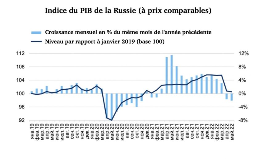 Selon nos estimations, la contraction du PIB de la Russie en mai dernier était de 2,1% par rapport à mai 2021 et de 0,24% par rapport au précédent mois (la saisonnalité étant éliminée), ce qui indique la capacité forte d’adaptation de l’économie nationale aux nouvelles conditions extérieures. A titre de comparaison, au deuxième trimestre 2020 en raison de la pandémie et du confinement, le PIB avait reculé de 7,4 % sur un an (notre estimation pour le IIe trimestre 2022 – moins 2,4%).