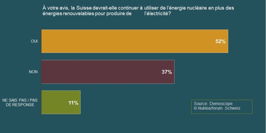 - 52% des personnes interrogées estiment que la Suisse doit continuer à utiliser l’énergie nucléaire pour produire de l’électricité, en plus des énergies renouvelables,