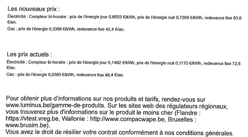 Il peut comparer ses anciens tarifs 0.1485 euros le kWh avec les nouveaux qu’il va devoir payer qui sont presque 6 fois plus élevés.