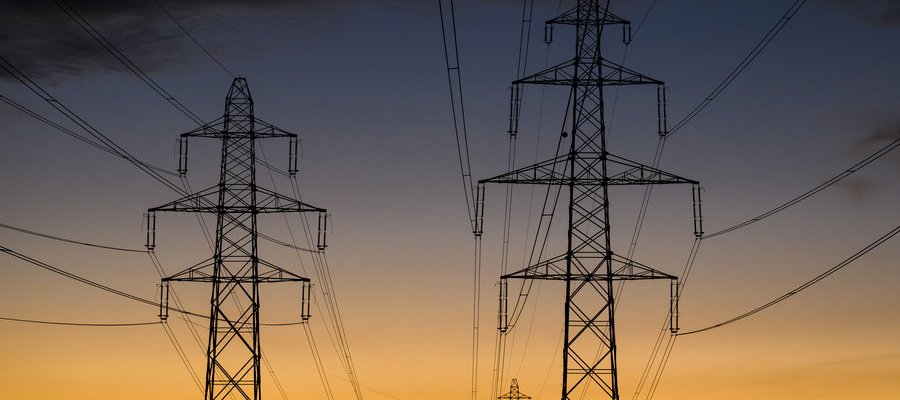 Le soleil se couche derrière les pylones de la ligne à haute tension du réseau électrique, dimanche 18 septembre 2022, à Romanel. — © Jean-Christophe Bott/Keystone