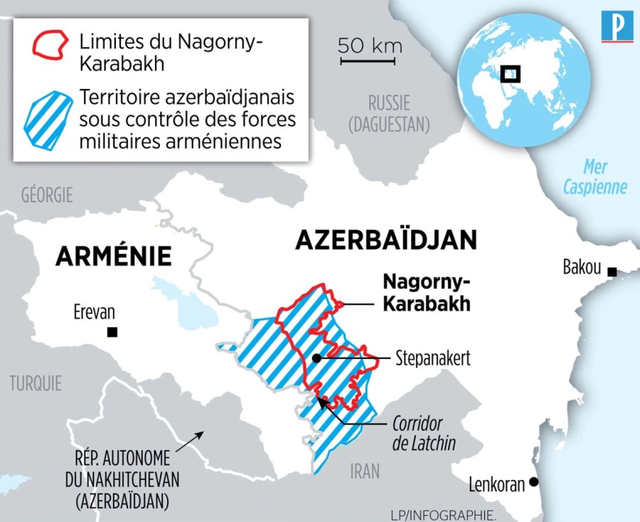 La carte est fausse. La partie bleutée ne correspond pas à la partie controlée par les forces arméniennes aujourd’hui!