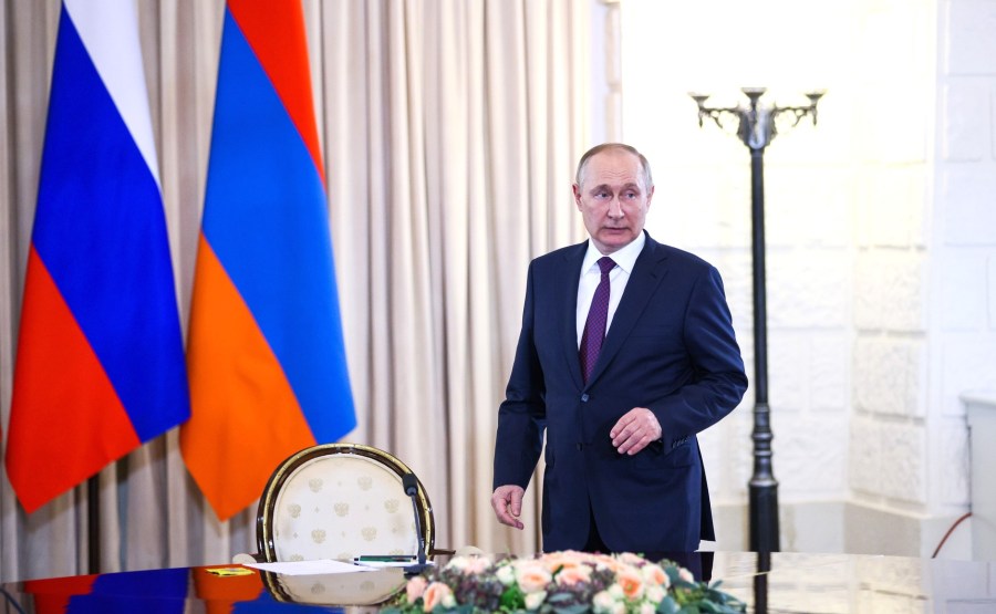 12 sur 12 À la fin des pourparlers trilatéraux avec le président de l’Azerbaïdjan et le Premier ministre de l’Arménie. Photo : Sergueï Bobylev, TASS