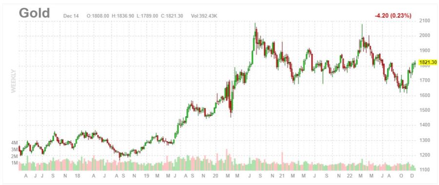 Les cours de l’or repartent à la hausse et franchissent à nouveau la barre symbolique des 1 800 dollars l’once dans un contexte où les marchés pensent que le pire de l’inflation se trouve derrière-nous et que la Fed devrait devenir moins sévère et moins dure dans sa politique monétaire.