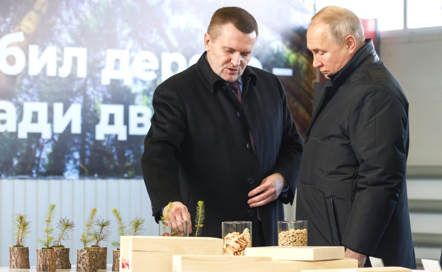 1 SUR 8 Visite du complexe de l’industrie du bois Ustyansky. Avec l’envoyé plénipotentiaire présidentiel dans le district fédéral du Nord-Ouest Alexander Gutsan et le gouverneur de la région d’Arkhangelsk Alexander Tsybulsky. Le directeur général du groupe ULK Vladimir Butorin (à gauche) donne des explications. Photo : Alexeï Filippov, RIA Novosti