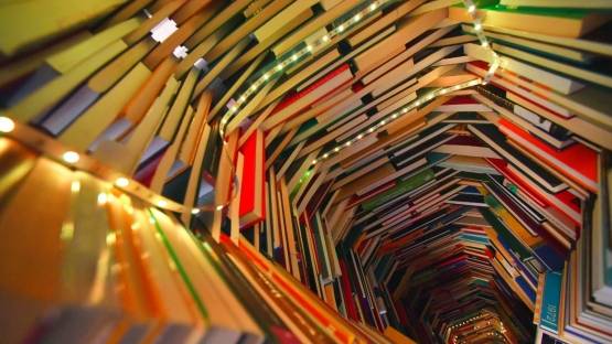PHOTO L’ « accélérateur de connaissances » à la bibliothèque de l’AIEA. Cette œuvre est composée de plus de 800 vieux livres. (Photo : D. Calma/AIEA)