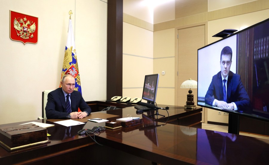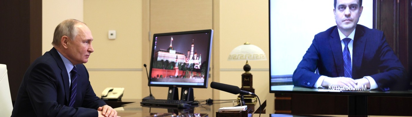 Vladimir Poutine rencontre Mikhail Kotyukov par appel vidéo. Le président a signé un décret exécutif nommant Mikhail Kotyukov au poste de gouverneur par intérim du territoire de Krasnoïarsk.
