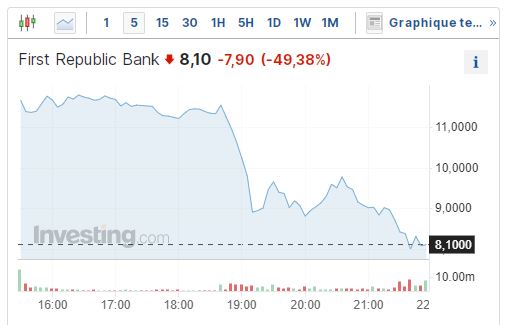 D’ailleurs, regardez ce qu’il s’est passé hier soir sur la bourse américaine. First Republic Bank dévisse de presque 50%. Une chute considérable et très inquiétante.