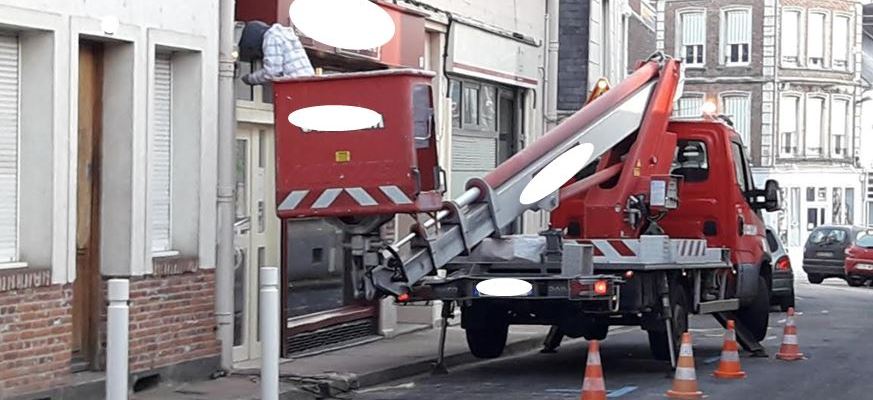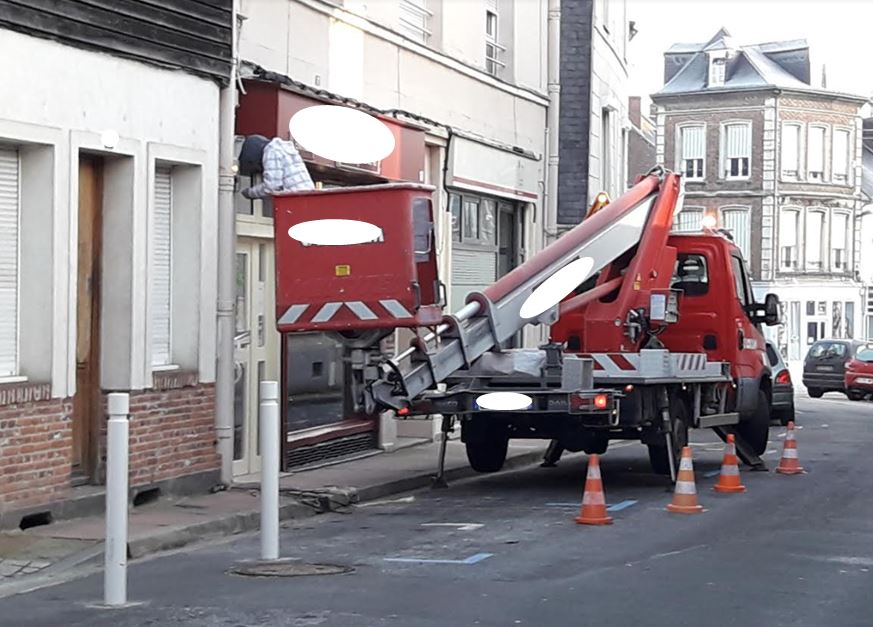 Aujourd’hui, plus personne ne peut monter à une échelle même sur deux barreaux. C’est légitime d’un point de vue de la sécurité. Une nacelle est bien plus sure. Mais une nacelle avec deux gus le sera encore plus. Et puis une nacelle installée de manière fixe sera encore plus sûre qu’une nacelle mobile et petit à petit parce qu’il y a toujours une bonne raison, vous vous retrouvez à attendre 6 mois pour qu’un gus de France Télécom, enfin non, un sous-traitant d’orange loue une nacelle et la déplace pour venir pour faire un branchement à 60 centimètres de hauteur comme le montre cette photo prise dans ma rue. Regardez attentivement cette photo.