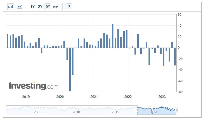 Il faut relativiser le chiffre communiqué par cet indice car il est fortement volatil mais la tendance est là, et l’on sent bien chiffre après chiffre, la dégradation qui s’opère dans le dynamisme de l’économie américaine en avance sur l’économie européenne en ce qui concerne les conséquences des hausses des taux d’intérêt.