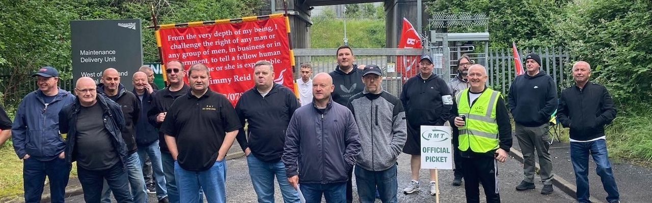 PHOTO 7 Des cheminots en grève font le piquet pendant la grève nationale des chemins de fer au Royaume-Uni au dépôt de maintenance de Cowlairs à Springburn, au nord de Glasgow, le 25 juin 2022 [Photo: WSWS]