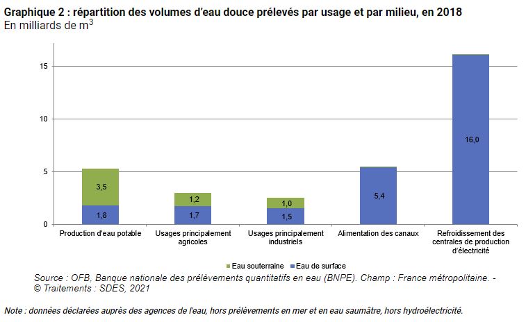 Les usages agricoles comme industriels restent totalement marginaux quand on regarde ce graphique par rapport au 16 milliards pour le refroidissement des centrales et les 5.4 milliards pour l’alimentation des canaux, soit 21 milliards rien que pour ces deux catégories.