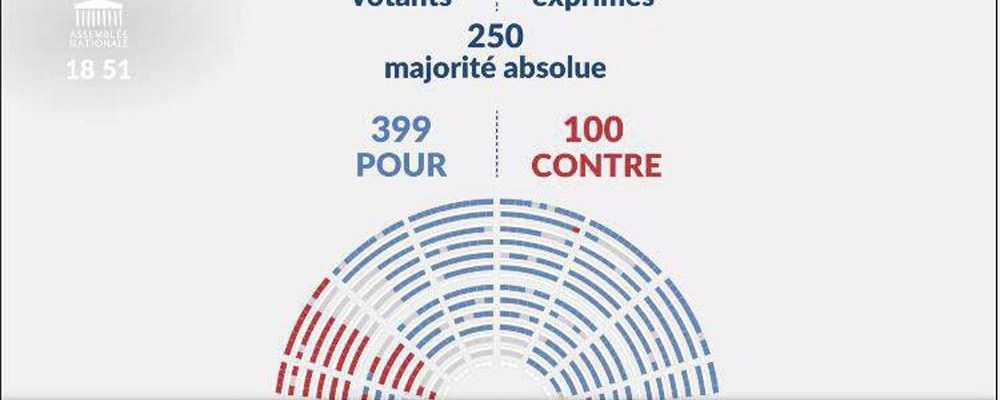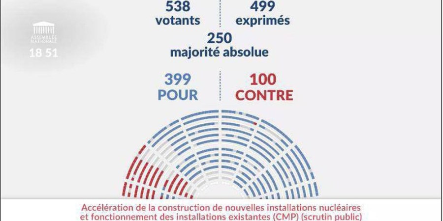 Résultat du vote à l’Assemblée Nationale le 16 mai 2023. Tweet de la Première ministre française, Élisabeth Borne: «Continuons de rassembler et de bâtir des majorités autour de grands projets comme celui-ci: devenir la première grande nation à s’émanciper des énergies fossiles».