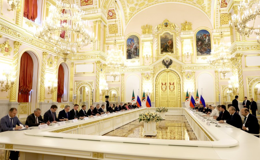 Notre pays attache une importance particulière à ses relations avec l’Algérie, que l’on peut qualifier de liens stratégiques. En nous rendant dans cette salle aujourd’hui, Monsieur le Président et moi-même avons rappelé que les relations entre la Russie et l’Algérie ont commencé à prendre forme et à se développer au milieu des années 1950. On peut dire sans exagération qu’il s’agissait déjà de relations stratégiques.
