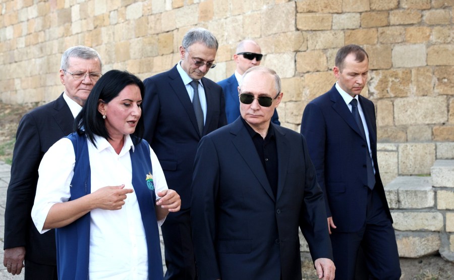 12 sur 32 A la citadelle de Naryn-Kala. De gauche à droite, le chef du Daguestan Sergei Melikov, le guide Kabutar Talibova, le chef de Derbent Rustambek Pirmagomedov et l’envoyé plénipotentiaire présidentiel dans le district fédéral du Caucase du Nord Yury Chaika. Photo : Sergueï Savostyanov, TASS