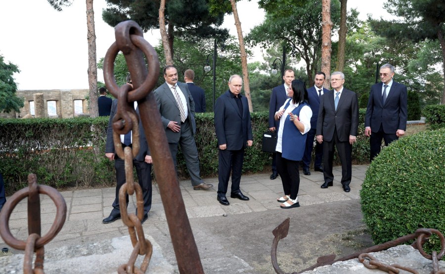 Nous sommes au Daghestan, à Derbent, l’une des villes les plus anciennes, ou plutôt la plus ancienne ville de Russie. Nous avons récemment célébré son 2 000e anniversaire. Entre-temps, les premières colonies ont commencé ici il y a 5.000 ans, ce qui est confirmé par des fouilles archéologiques qui ont été faites à l’époque soviétique, je crois, à partir de 1971. Il y a la plus ancienne mosquée de Russie. Nous l’avons également visité aujourd’hui.