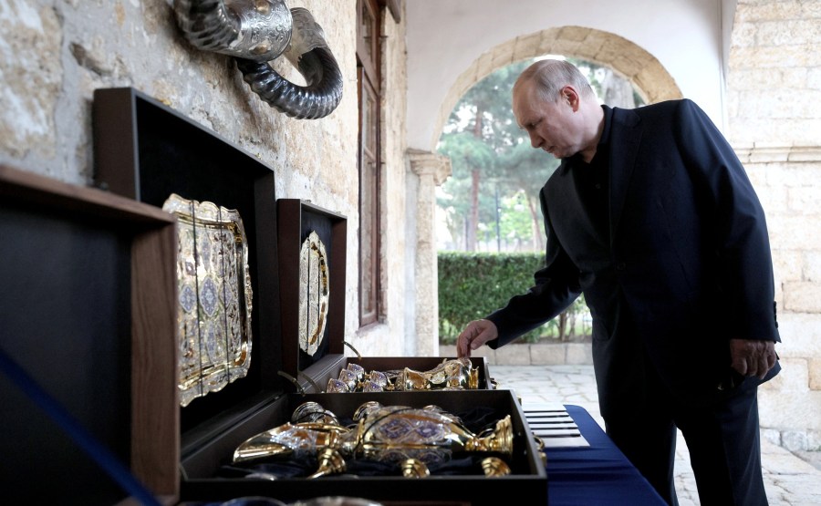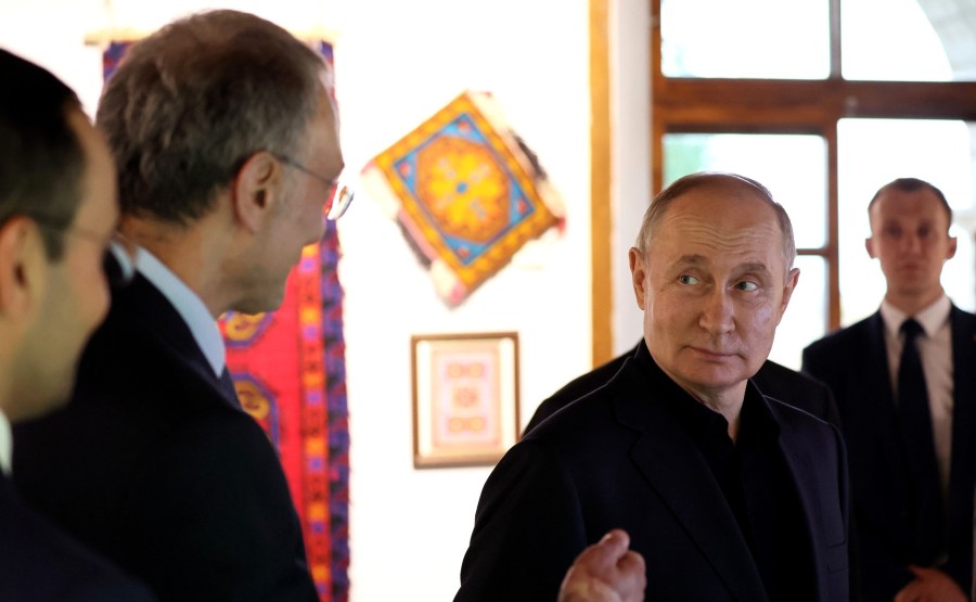 14 sur 32 A la citadelle de Naryn-Kala, Vladimir Poutine regarde l’exposition d’artisanat populaire.
