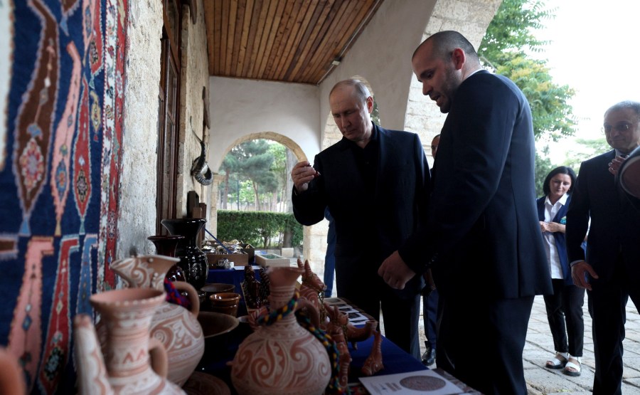 15 sur 32 A la citadelle de Naryn-Kala, Vladimir Poutine regarde l’exposition d’artisanat populair