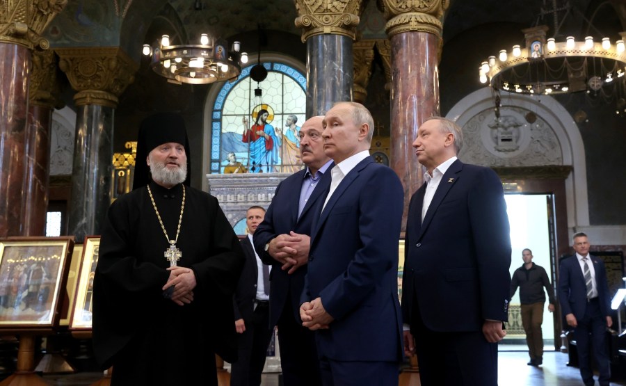 Vladimir Poutine et Alexandre Loukachenko ont notamment visité l’église principale du monastère, la cathédrale de la Transfiguration du Sauveur, où sont conservées les reliques des fondateurs du monastère, Saint-Serge et Germain.