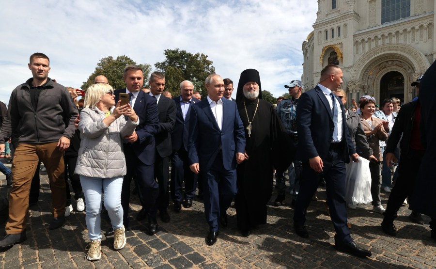 1 sur 3 Lors de la visite de la Transfiguration Valaam du Monastère Patriarcal du Sauveur. Avec le président de la République de Biélorussie Alexandre Loukachenko. Photo : Alexander Demianchuk, TASS