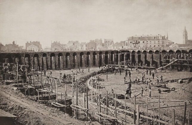 Photo : Dérivation de la Vanne. Réservoirs de Montrouge. Sur la droite, l’église Saint-Pierre-de-Montrouge, 1883, Southern Methodist University, @WikiMediaCommons.