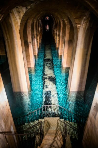 les filtres purifiants à base de charbon pulvérisé. Le filtre de Pierbourg combinait ces deux méthodes, en y ajoutant une éponge pour arrêter les particules de sable. Photo : Grands bassins du réservoir de Montsouris, Paris XIVe. @WikiMediaCommons.