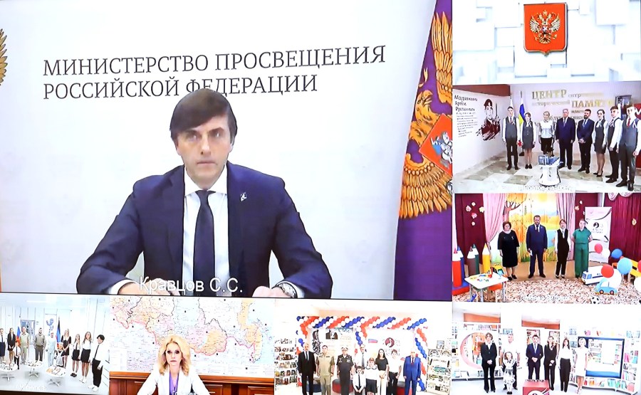 5 sur 6 Participants à la cérémonie d’ouverture des nouveaux établissements d’enseignement dans les régions russes (par vidéoconférence).