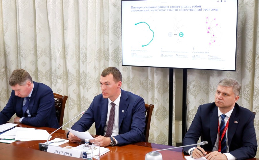 1 sur 9 Lors de la réunion sur le développement des villes d’Extrême-Orient. Avec le vice-Premier ministre et envoyé plénipotentiaire du Président dans le District fédéral d’Extrême-Orient Yury Trutnev (à gauche) et le ministre du Développement de l’Extrême-Orient et de l’Arctique Alexei Chekunkov.