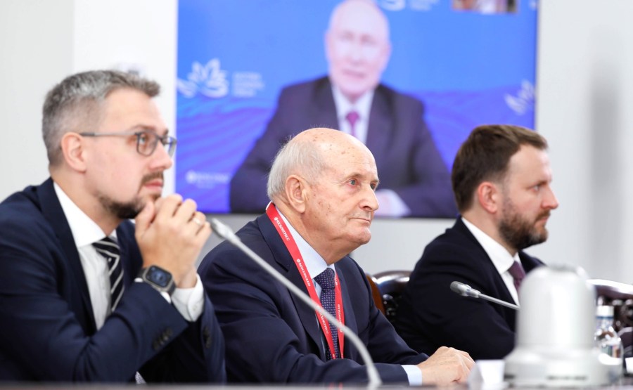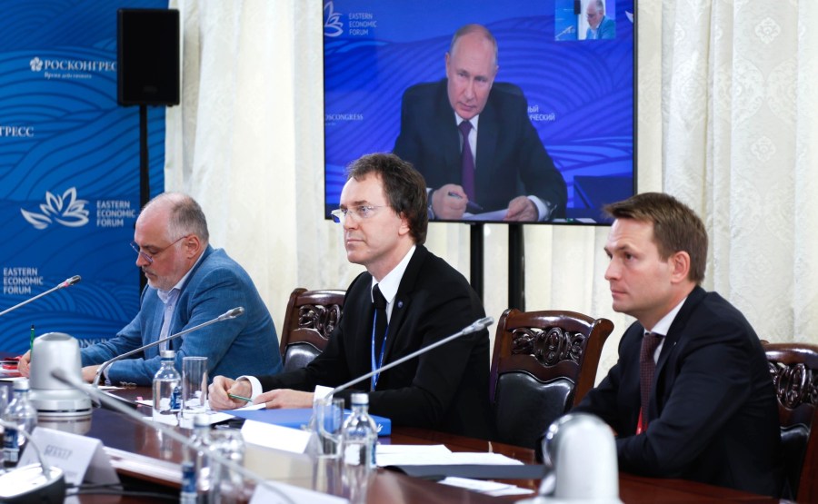 3 sur 8 Lors d’une réunion avec les modérateurs du Eastern Economic Forum (par vidéoconférence). De gauche à droite : Mikhaïl Khomitch, directeur des projets spéciaux à l’Agence pour les initiatives stratégiques visant à promouvoir de nouveaux projets, Alexander Bekker, professeur et directeur scientifique de l’Institut polytechnique de l’Université fédérale d’Extrême-Orient, assistant du président Maxim Oreshkin. Mikhaïl Kireev, Congrès de Ross
