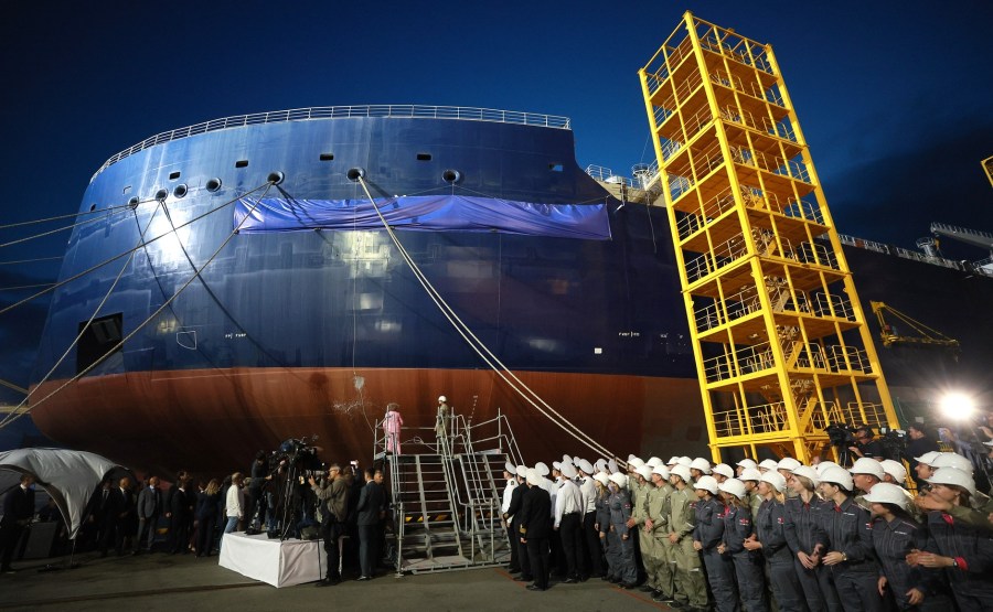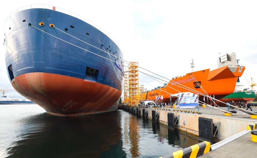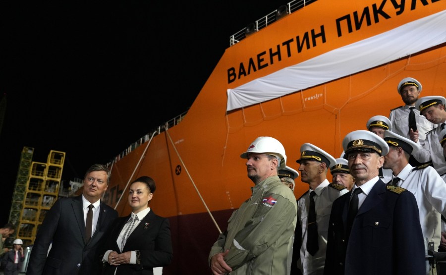 15 sur 18 Lors de la cérémonie de remise du nom du pétrolier Alexeï Kossyguine Arctique (à gauche) et du pétrolier-navette Valentin Pikul au complexe de construction navale de Zvezda. Photo : Vladimir Smirnov, TASS