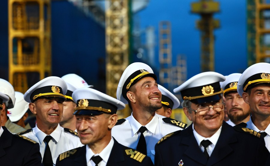 12 sur 18 Lors de la cérémonie de remise du nom du pétrolier arctique Alexeï Kossyguine (à gauche) et du pétrolier-navette Valentin Pikul au complexe de construction navale de Zvezda. Photo : Vladimir Smirnov, TASS