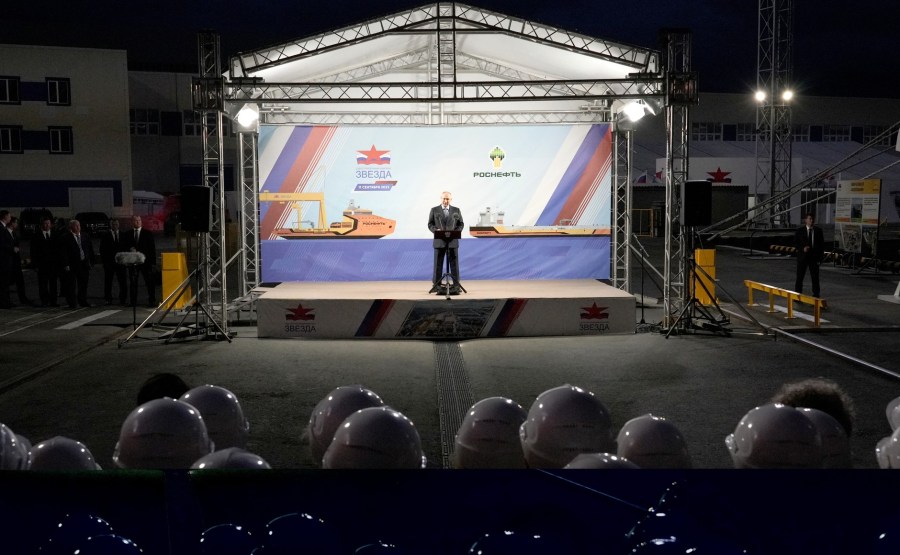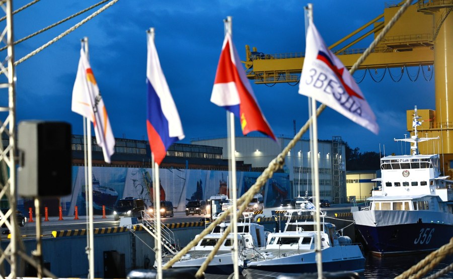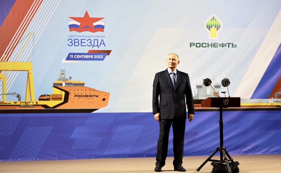 Vladimir Poutine est arrivé au complexe de construction navale de Zvezda où il a participé à la cérémonie de remise du nom du pétrolier arctique Alexeï Kossyguine et du pétrolier navette Valentin Pikul.