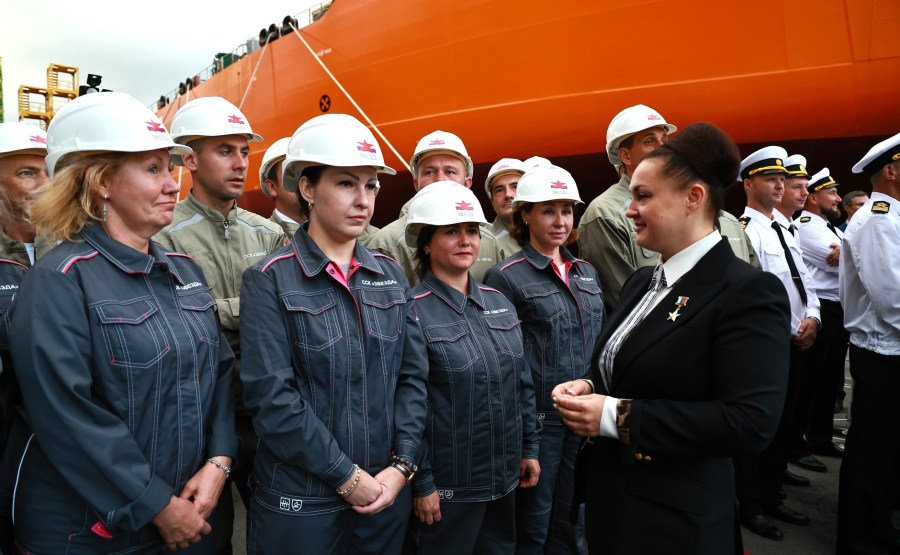4 sur 18 Avant la cérémonie de remise du nom du pétrolier Alexeï Kossyguine Arctique…